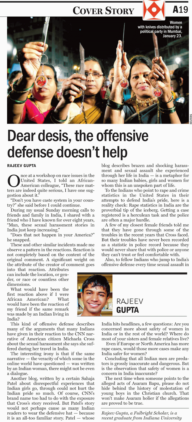 To the Indians who point to rape and crime statistics in US in their attempts to defend India’s pride, here are some questions. Are you concerned more about safety of women in India or in the rest of the world? Where do most of your sisters and female relatives live? Even if Europe or North America has more rape cases, would those more cases make any India safer for  women? Concluding that all Indian men are predators is grossly inaccurate and dangerous. But is the observation that safety of women is a concern in India (in no relative context, but absolute context) inaccurate? Even if there is one case in a year in all of India, will Indians not be doing disservice to themselves in defending the country by comparing themselves with the countries that are worse? Isn’t even one a matter of shame?
