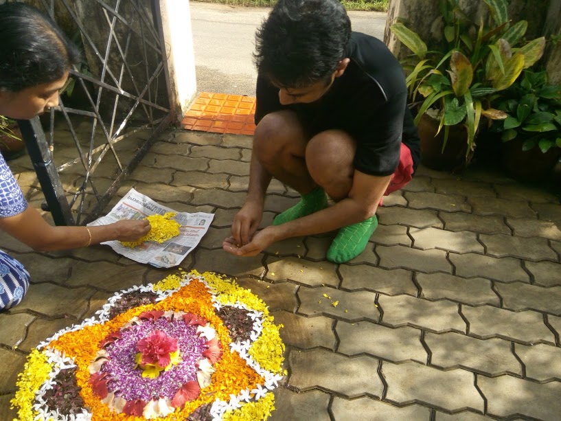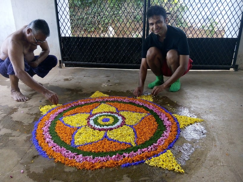 In less than an hour of having arrived here, I had hit the street. Wherever I looked, I would smile and people will smile back. After every 50 or 100 meters, I would look back to make sure I remember to way back. At every junction, before turning, I would make mental note to be able to trace the path back. I crossed a house in whose courtyard, a beautiful pookalam was work in progress. I stopped and asked for a chat. The family asked where I lived. I explained to them how I landed in Palakkad. They gave a perplexed smile. I wouldn’t be surprised if people found the idea of couchsurfing bizarre! I asked if I could help in making the pookalam. The grandfather gladly allowed me to assist him. We chatted and when I was leaving, the son in the family told me that I should come to their place for Sadya if i had no place to go for lunch. I had known them for only few minutes, but they were so nice that they offered me to join them for Onam feast! I bid them goodbye and continued to run around , and take pictures.